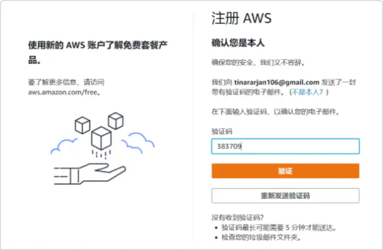 验证电子邮件地址及设置AWS账户密码。