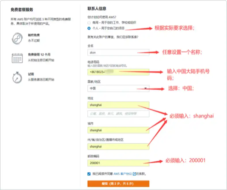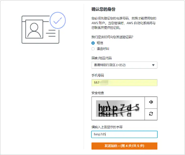 验证手机号码,完成AWS账户注册。